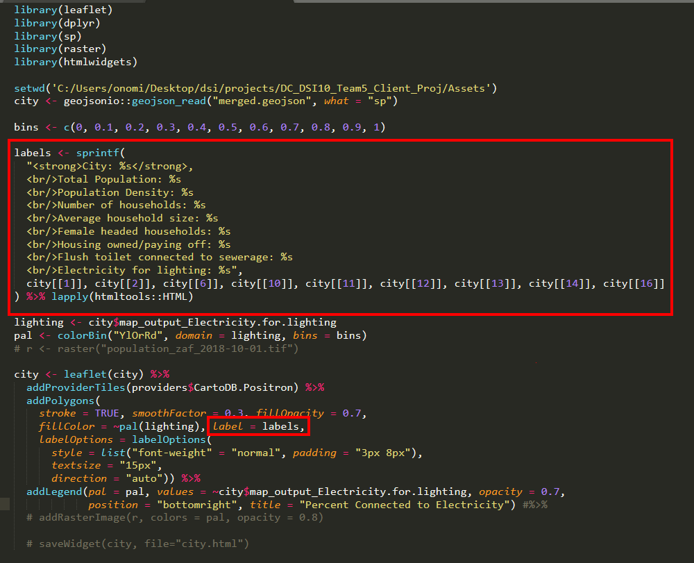 Most of the stuff you can teach yourself by copying the code on the R Leaflet site but the part I found most difficult was the labeling system. Labels are important because they allow you to display attribute data for geographical boundaries. How many people live in a district, what’s the poverty rate in district?